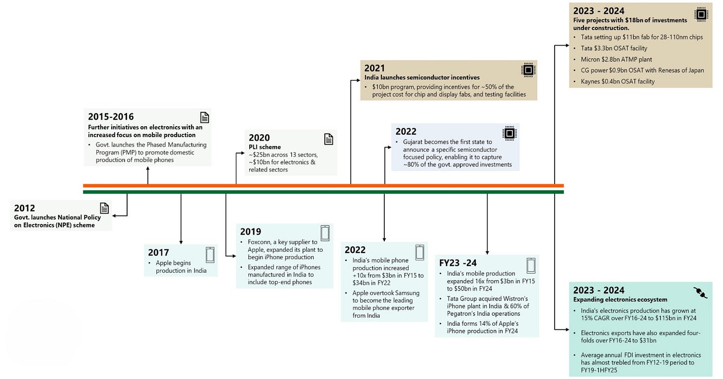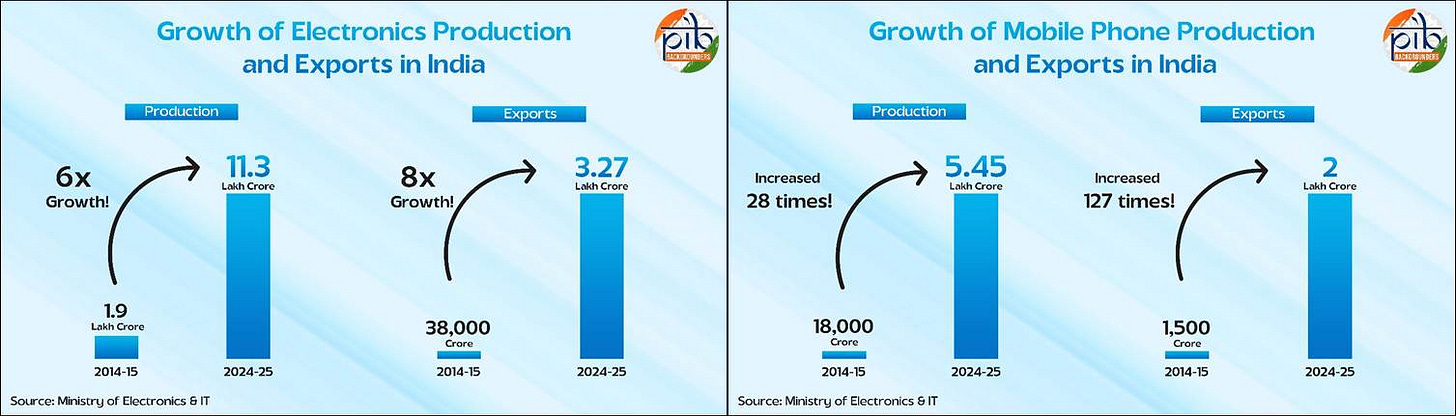 Electronics production rose from ₹1.9 lakh crore (FY15) to ₹11.3 lakh crore (FY25).